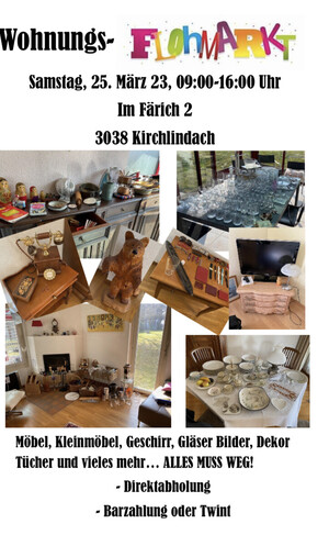 Hausflohmarkt in Kirchlindach. Adresse: Im Färich2 Darum: Sa 25.3.2023, 9.00...