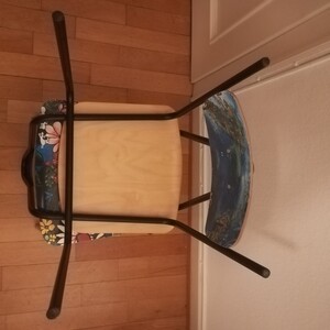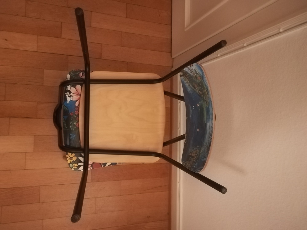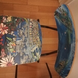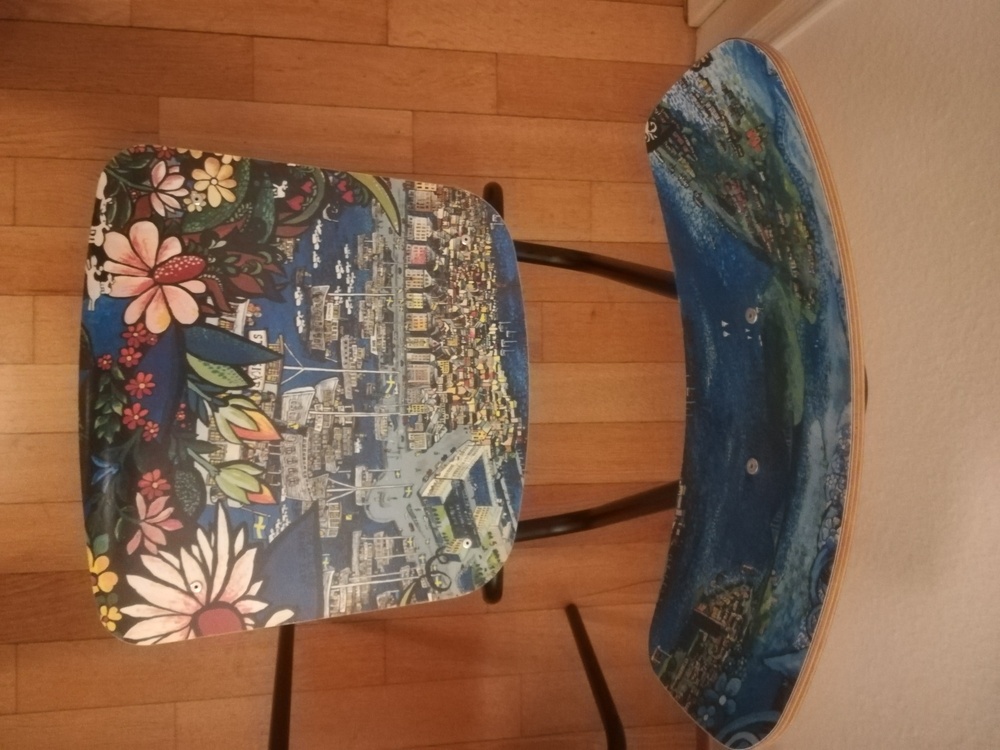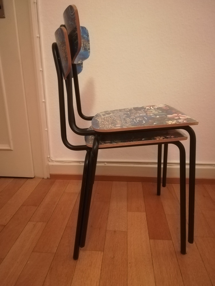 Diese Stühle stammen aus einem Museumscafé in Stockholm. Sie zeigen beide das gleiche Motiv über Stockholm. Gemalt ist der Entwurf von dem schwedischen Künstler Bangt Elde. Sie sind sehr hochwertig verarbeitet, gut stapelbar und weisen nur wenig Gebrauchsspuren auf, wie auf den Fotos zu sehen. Die Sitzfläche ist etwa 48 cm hoch.