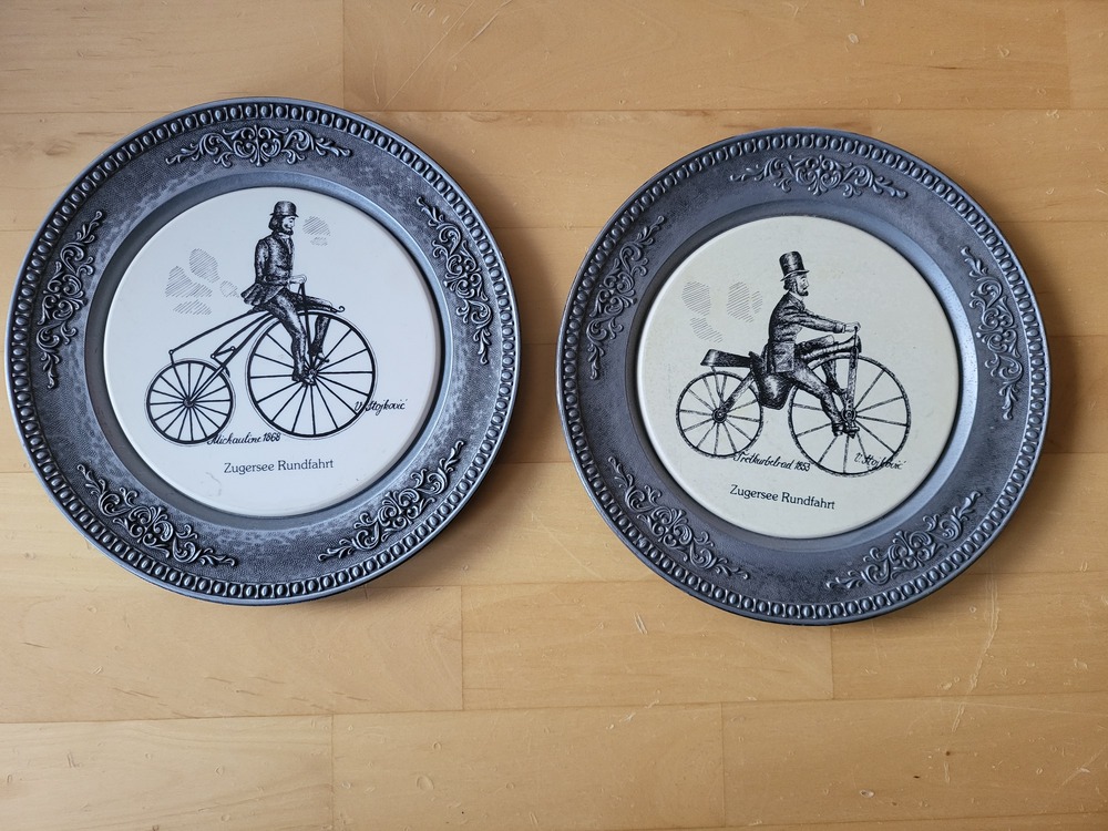Verkaufe zwei gebrauchte Sammelteller aus Metall & Porzelan der Zugersee Rundfart, mit nostalgischen Fahrrad-Motiven.