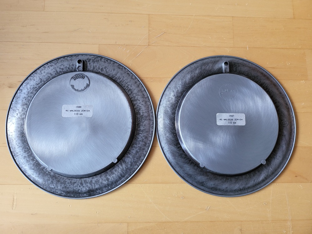 Die Teller haben einen Durchmesser von ca. 19 cm und sind mit "Rusto" und "RC Waldegg Zürich" gemarkt.