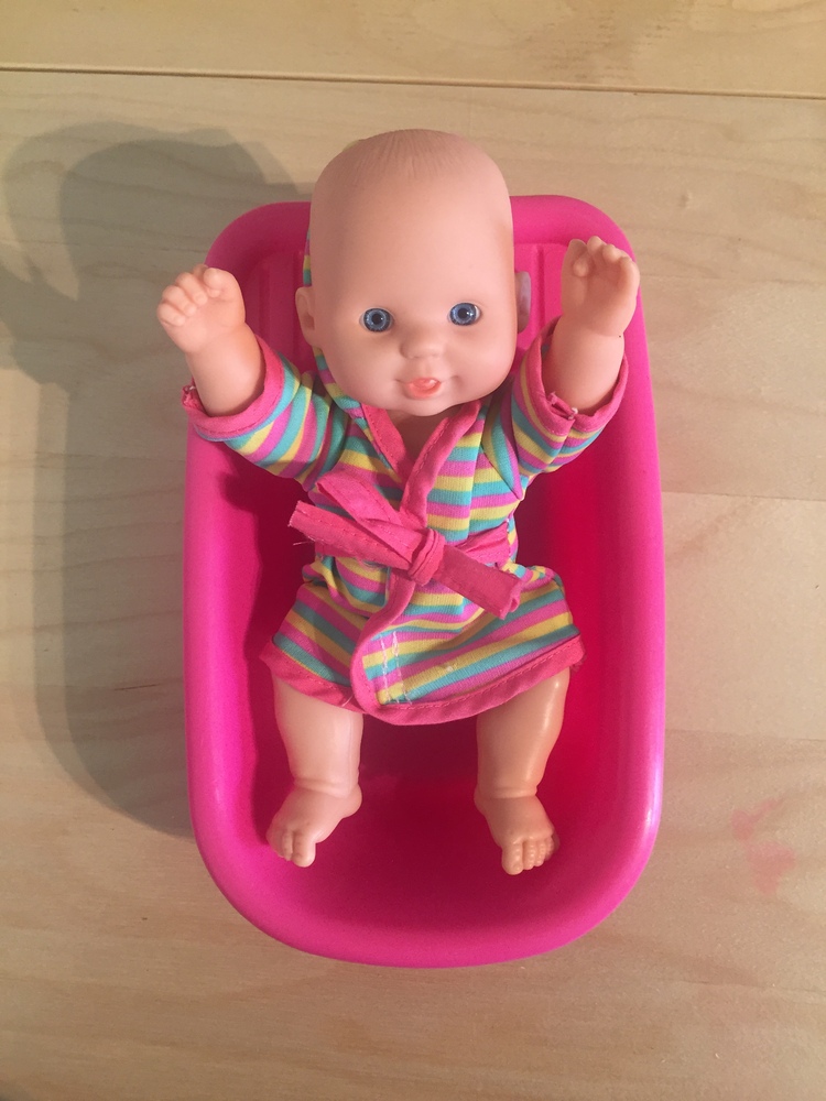 Badebaby klein mit Bademantel und Badewanne. Wenig bespielt und in gutem Zustand.
