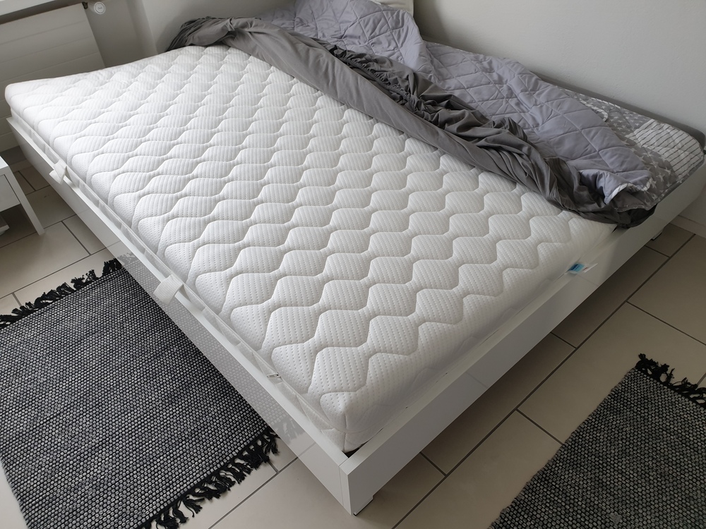 Bett Neu weiss hochglanz komplett mit Matraze und Lattenrost. Grösse 160x200cm. Plus 1x kleinen Nachtisch dazu (gekauft in Interio Dübendorf)