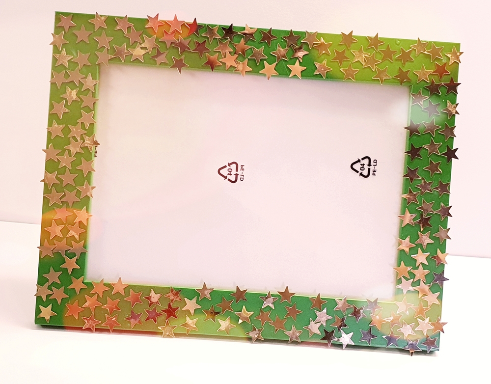 Zwei schöne Bilderrahmen blau und grün. Dee blaue mit vielen Spiegelhertzen, der grüne mit goldenen Sternen Deko. Masse für Bilder bis