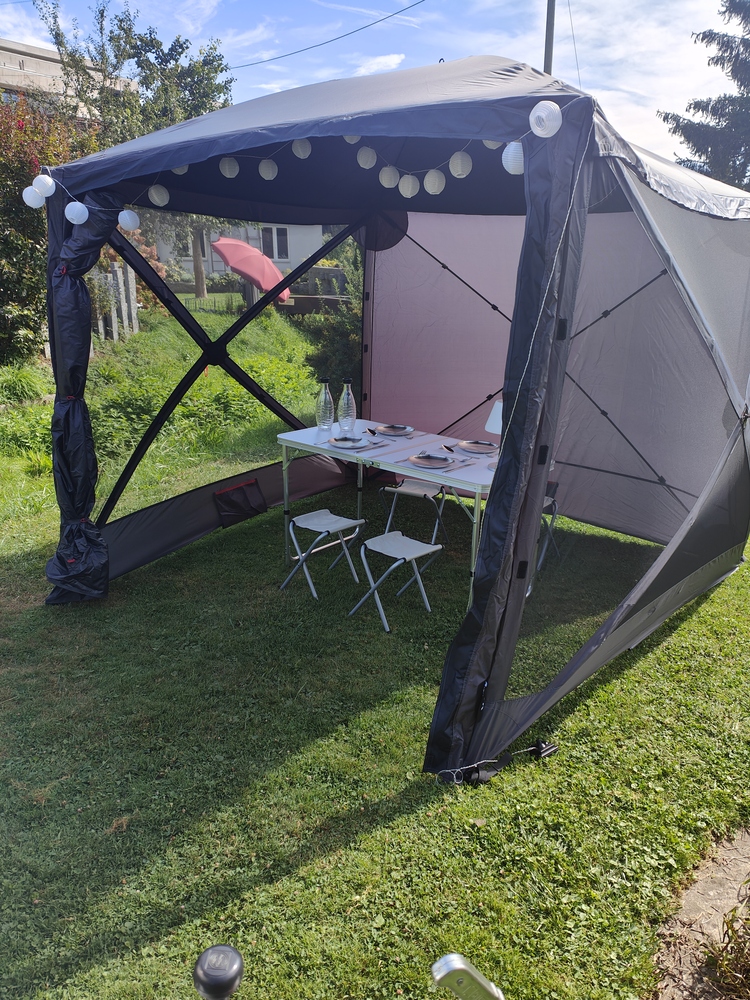 - **Zusätzliches Zelt:** Inklusive ist ein freistehendes Qeedo Quickhub-Zelt (2024) mit den Maßen 2,44 m x 2,10 m und einer Höhe von 1,90 m. Der Aufbau ist in weniger als 2 Minuten erledigt und bietet idealen Schutz vor Sonne und Regen, perfekt für entspannte Stunden im Freien.