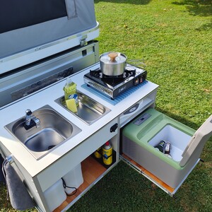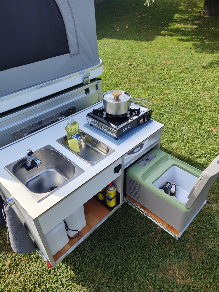 - **Anhänger:** Der Anhänger der Marke Anssems (700 kg, 2024) ist mit einer ausziehbaren Küche ausgestattet, die über einen Frischwasser- und Abwassertank sowie eine 9-Liter-Kompressorkühlbox der Marke Alpicool verfügt.