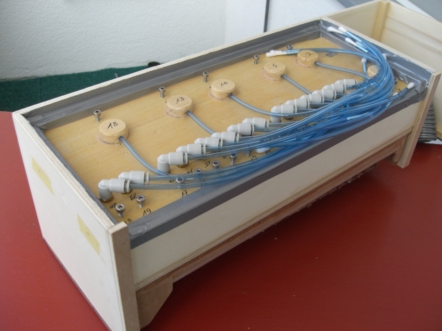 Drehorgel-Windlade, für den Bau einer 20-Tonstufen-Drehorgel, bestückt mit Zungenstimmen.