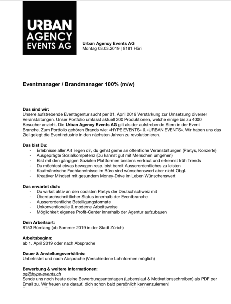 Branche. Zum Portfolio gehören Brands wie: «HYPE EVENTS» & «URBAN EVENTS». Wir haben uns das Ziel gelegt die Eventindustrie in den nächsten Jahren zu revolutionieren.