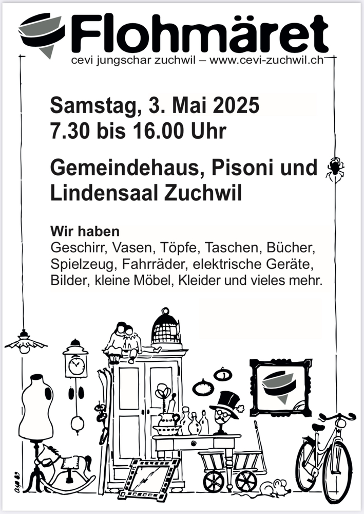 Am Samstag, 3. Mai 2025, findet von 7.30 bis 16.00 Uhr um das Gemeindehaus, Pisoni und Lindensaal in Zuchwil der beliebte Flohmarkt der Cevi Jungschar statt. Im Angebot: Geschirr, Vasen, Bücher, Spielzeug, Fahrräder, Kleidung, kleine Möbel, Elektrogeräte und vieles mehr. Kommen Sie vorbei und finden Sie Ihr persönliches Fundstück!