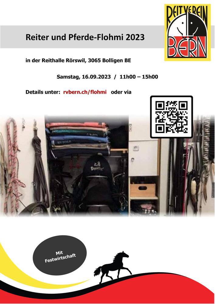 Inserat merkenAm Samstag, 16. September 2023 organisiert der RV Bern in der Reithalle Rörswil in Bolligen das zweite Mal einen Flohmarkt für Pferd & Reiter.