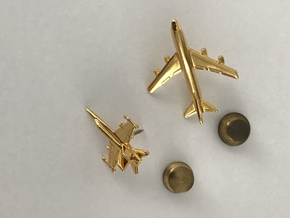 2 kleine goldfarbige Flugzeuge zum Anstecken. Das Grössere misst ca. 3 cm und das Kleinere ca. 2.5 cm. Beide Flugzeuge sind in einem super Zustand und haben keine Gebrauchsspuren.
