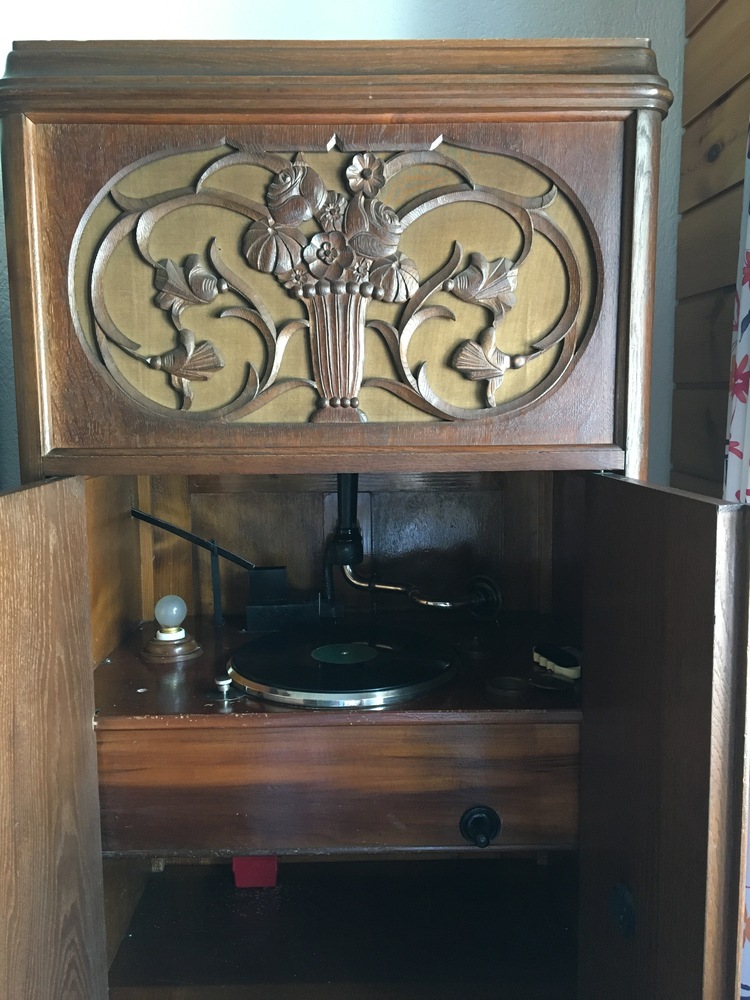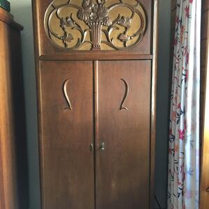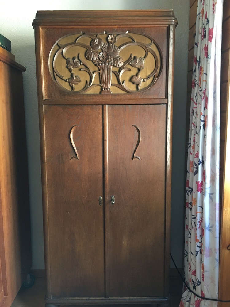 Antiker, originaler, funktionstüchtiger Trichter-Grammophon, Marke: Phoenix, Jahrgang : 1927, in Schrank eingebaut, Schrank-Gr.: H 172, B 72, T 51 cm, Eiche furniert, dunkel gebeizt, Einteilung: oben Trichter, mitte Grammophon mit Münzautomat, unten Plattenfächer.
