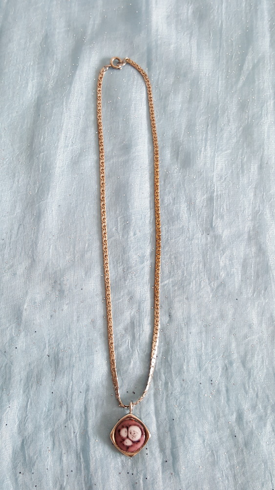 Federringverschluss, Länge 40,5 cm, Breite 3 mm. Anhänger Innenteil Lila-Weiss Töne.