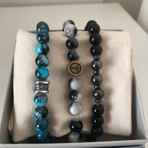 Das Armband besteht aus Kristalperlen. Sehr gute Verarbeitung. Dazu ist es Neu und ungetragen. Mit kleinen Symbolen in der Mitte.