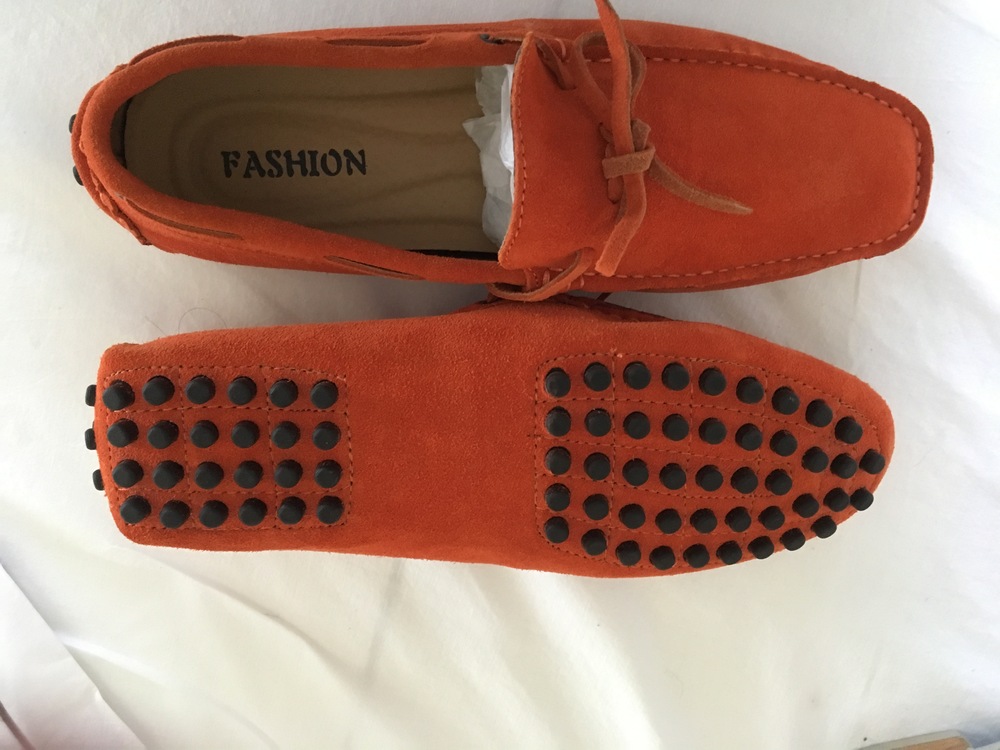 Herren-Mokassins orange. Innen und aussen echtes Leder. Neu, nie getragen, falsche Grösse gekauft.