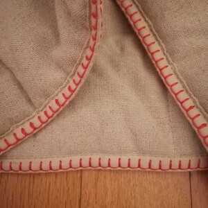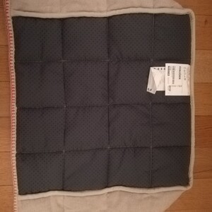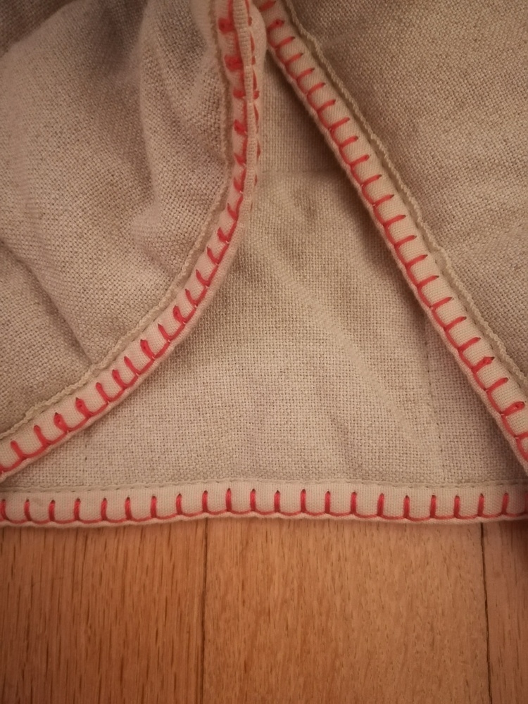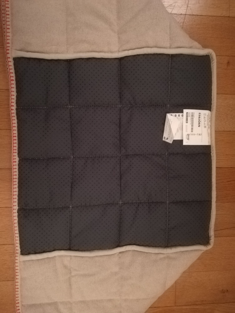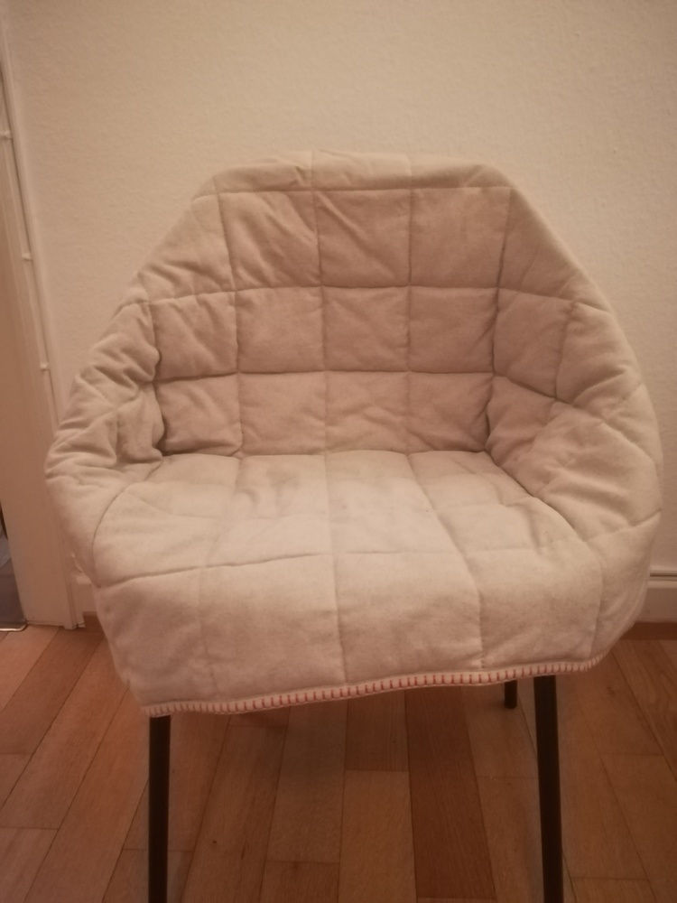 Diese Stuhlhusse gehört zum Küchenstuhl Esbjörn mit Armlehnen von IKEA. Die Kontaktfläche mit der Sitzfläche ist rutschfest gestaltet. Die beigen Säume sind mit einem orangenen Faden verziert. Es sind keinerlei Gebrauchsspuren sichtbar und das Textil wurde nur in einem rauch- und tierfreiem Haushalt genutzt.
