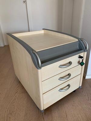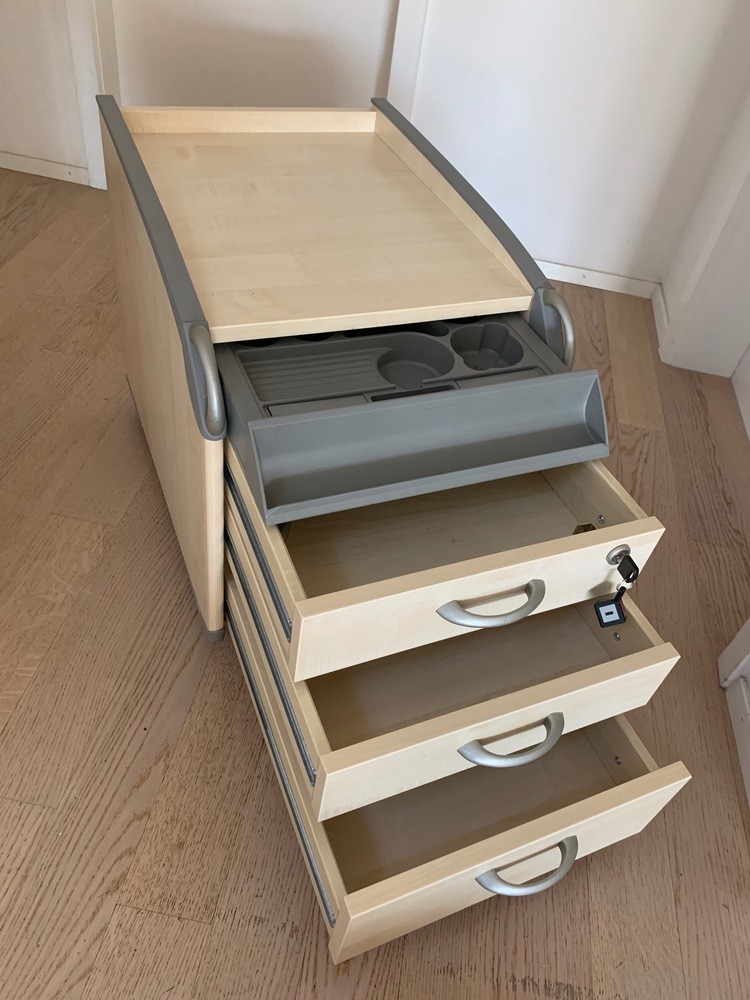 Der Rollcontainer passt unter den Schreibtisch oder kann wahlweise daneben platziert werden. Er hat 4 Schubladen, die oberste ist in verschiedene Segmente aufgeteilt für diverse Schreibutensilien. Die oberste Schublade ist abschliesbar.