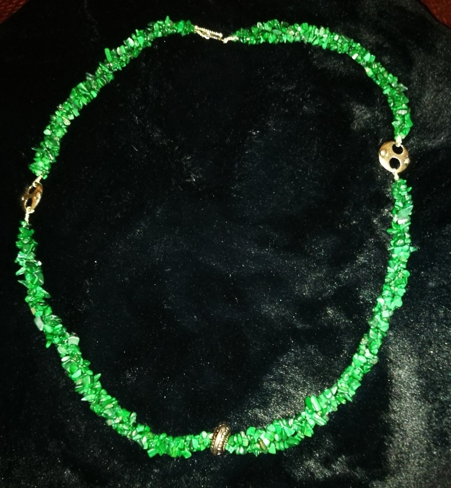 Malachit-Splitter, dreifach gezwirbelt, durch Tibetsilber -Scheiben verbunden.