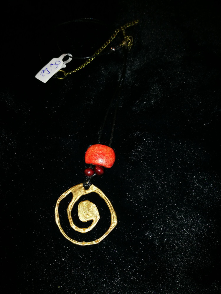 Der Anhänger aus glüssig gestrichener, gebrannter Bronze, aus Mel's Steinhöhle Atelier entsprungen. Er wird gehalten von schwarzem Baumwoll-Garn, mit zwei Sandelholzperlen, welche von einem breiten roten Korallen-Bead gestoppt werden.