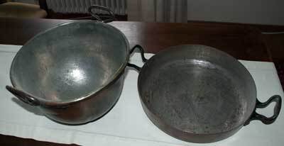 Zwei Töpfe (gemäss Bild) vermutlich aus Kupfer zu verkaufen. Der linke, grössere hat einen Durchmesser von 30cm und eine Höhe von 20cm. Achtung: Der Boden ist abgerundet, passt also nicht auf eine Kochplatte. Der rechte Kochtopf hat einen durchmesser von 30cm und eine Höhe von 7.5cm. Vermutlich Bratpfanne o.ä., jedenfalls dank flachem Boden gut als Pfanne benutzbar.