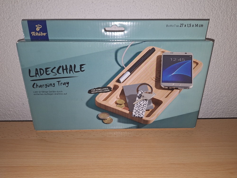 Ladeschale Tchibo 376755 für kabelloses induktives laden. Lädt Qi-fächge Geräte durch einfaches Auflegen drahtlos auf.