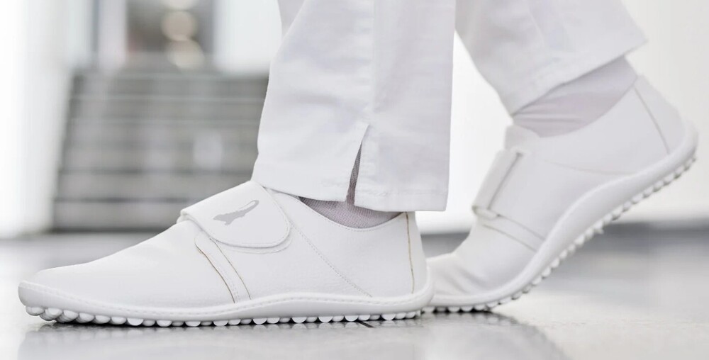 Ultraleichte und trotzdem robuste Barfußschuhe, die unter Anderem extrem gut für Pflegekräfte und Mitarbeitende im Gesundheitswesen geeignet sind. Sie garantieren ein bequemes, natürliches Tragegefühl während langer Arbeitsschichten. Dank der dünnen Sohle mit den halbkugelartigen Profilnoppen bieten sie festen Halt und Flexibilität. Aufgrund des Oberflächenmaterials und der geschlossenen Form wird das Eindringen von ablaufenden Flüssigkeiten verhindert. Desinfizierbar, abwaschbar, rutschfest, leicht und mithilfe des Klettverschlusses individuell verstellbar.