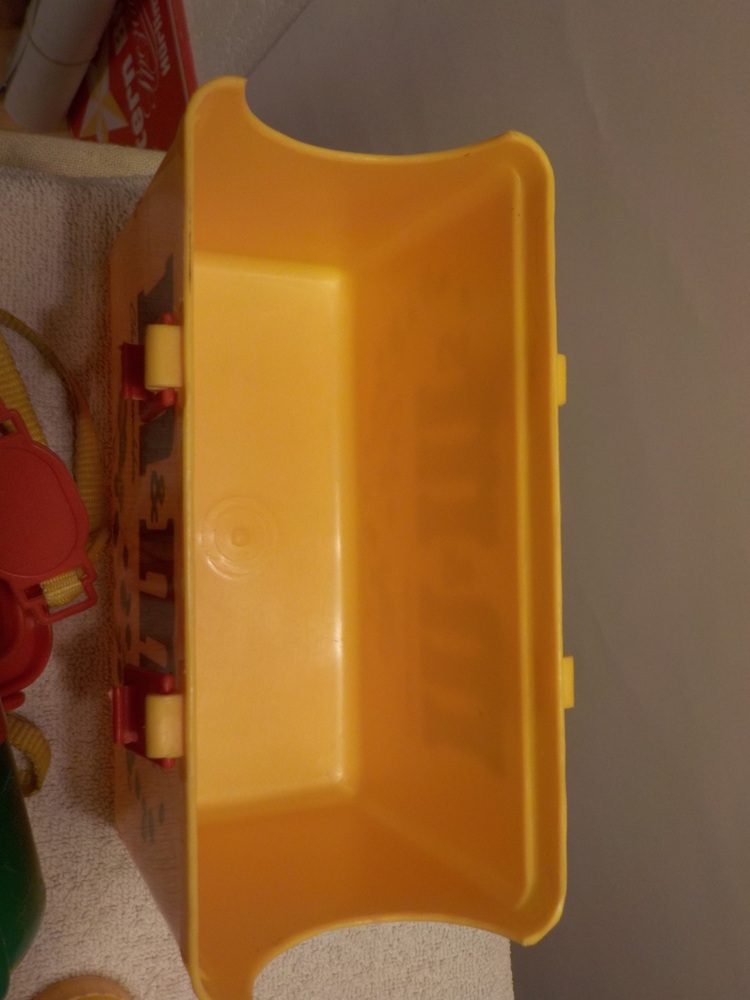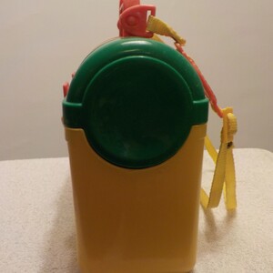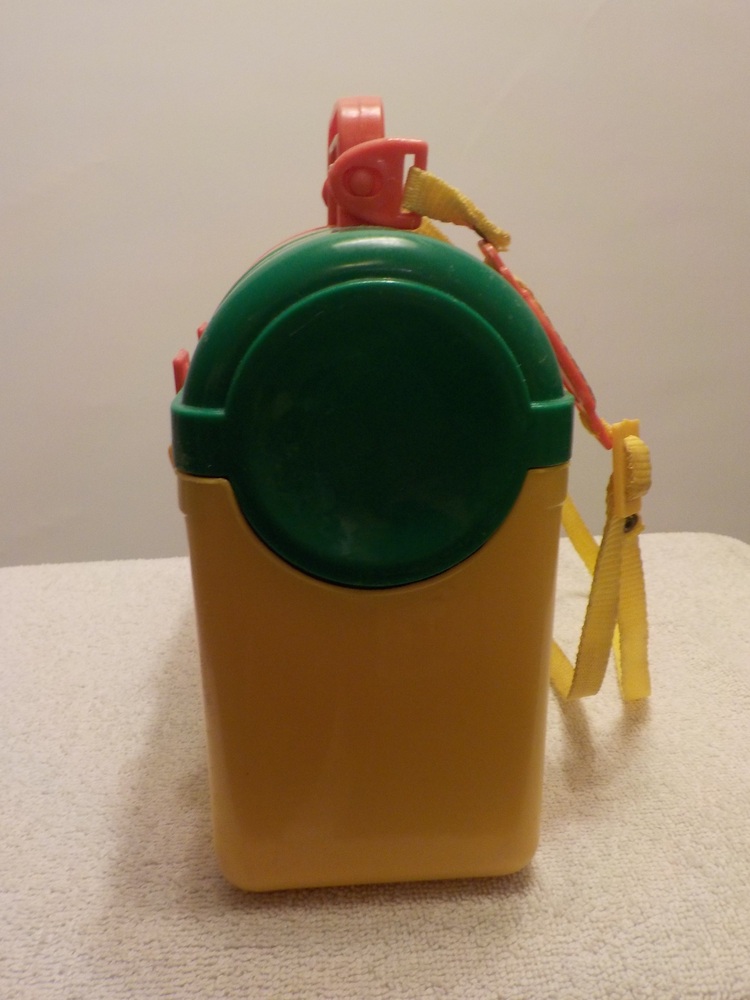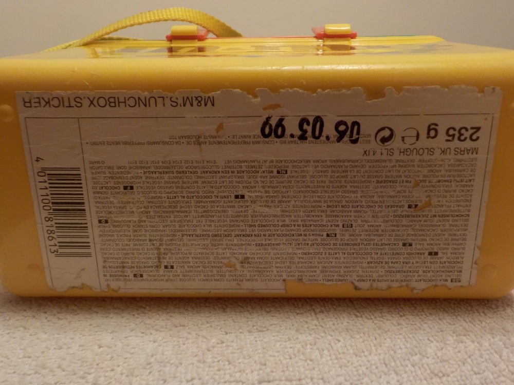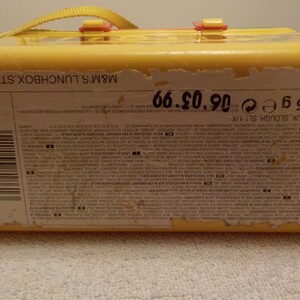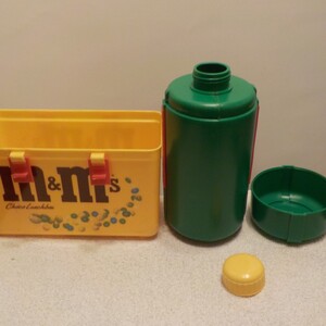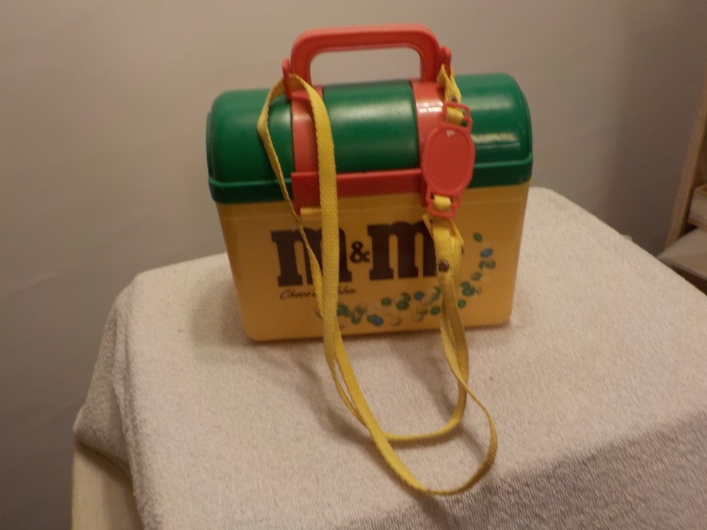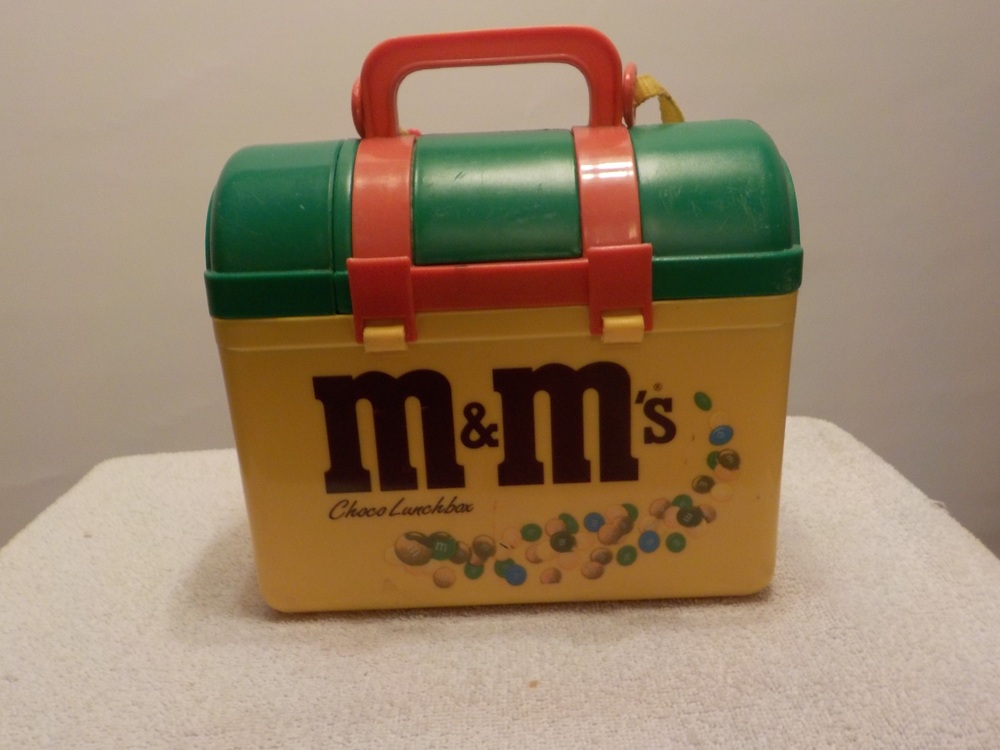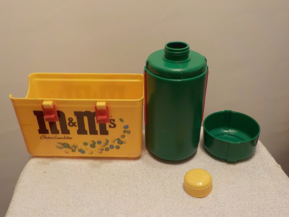 Lunch - Box von M&M^s /19cm Länge 19.5 cm Höhe mit Griff und 9.5cm Breit / im gutem Zustand mit leichten Gebrauchsspuren / Flasche ca. 7dl Inhalt / mit Schraubverschluss / aus dem Jahr 1999 / Etikette unten am aussen Boden nicht so schön ( siehe Bild 3 )
