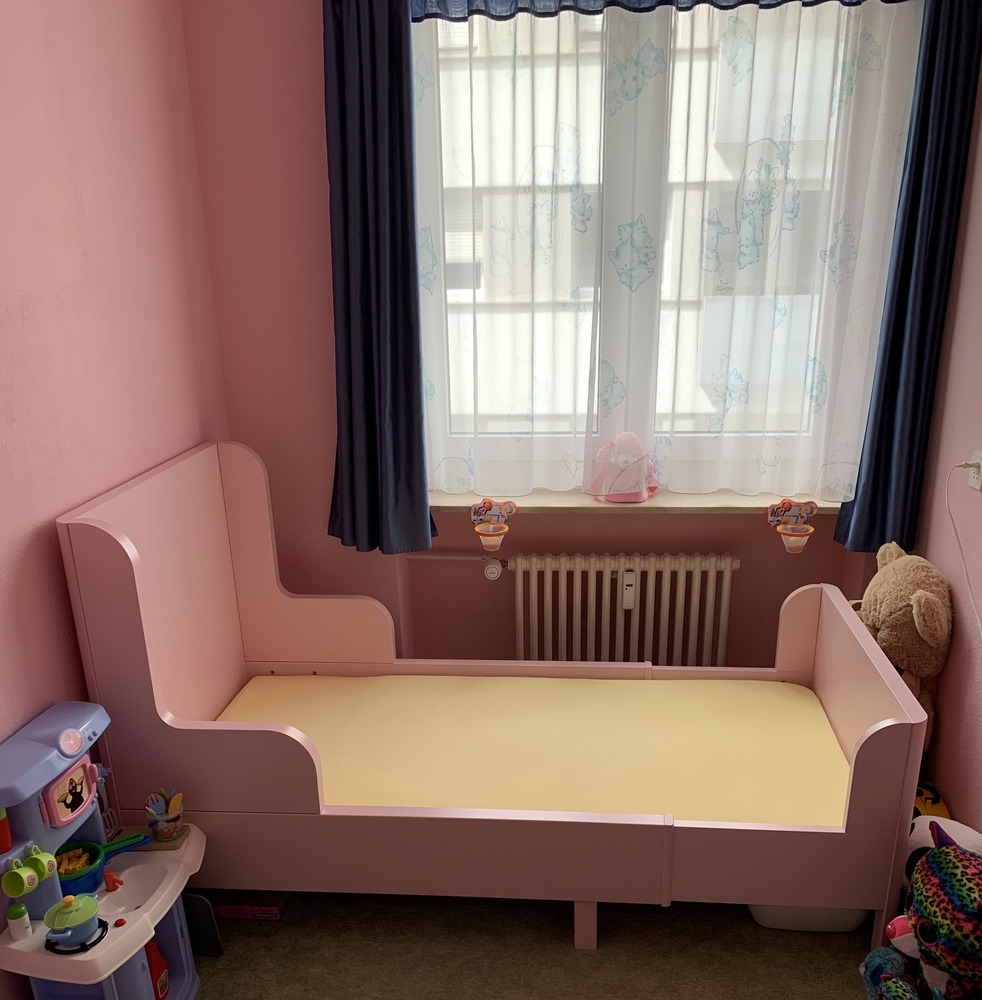Das Mädchenzimmer besteht aus Bett mit Matratzen, Kleiderschrank und Komode mit Schubladen. Bett und Matratzen sind verstellbar auf 140 cm. 160 cm und 200 cm. Das Möbel ist sehr gepflegt und seht wie Neu aus,