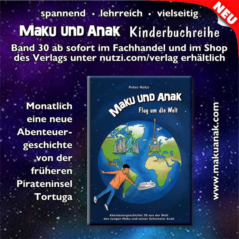 Maku stellt sich vor, er könne fliegen. Er schliesst die Augen, breitet seine Arme aus und steigt in die Höhe. Langsam fliegt er über das Schloss des Königs und der Königin, vorbei an der alten Piratenburg Adlerhorst, über die drei höchsten Berge der Insel, Spitzzahn, Strunk und Pater, hinaus aufs Meer. Unter sich sieht er Schiffe, die nicht grösser scheinen, als Nussschalen. Endlich taucht am Horizont Land auf. Was wird Maku auf seinem Flug um die Welt wohl alles erleben?