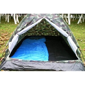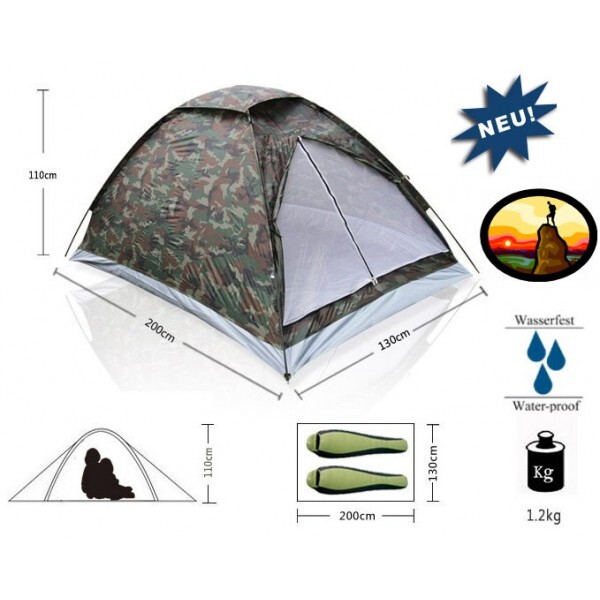 Freistehendes Camouflage Kuppelzelt für 2 Personen mit Gestänge. Leichter Aufbau und kleines Packmass. Fest angenähter, robuster Zeltboden schützt vor Feuchtigkeit. Bequemer Rundbogeneingang. Permanente Hochentlüftung und Moskitonetz Eingang. Die Nähte sind mittels Nahtband wasserdicht versiegelt und gewähren eine höhere Naht-Reissfestigkeit. Ideal für Rucksacktouren und Camping oder einfach beim Openair.