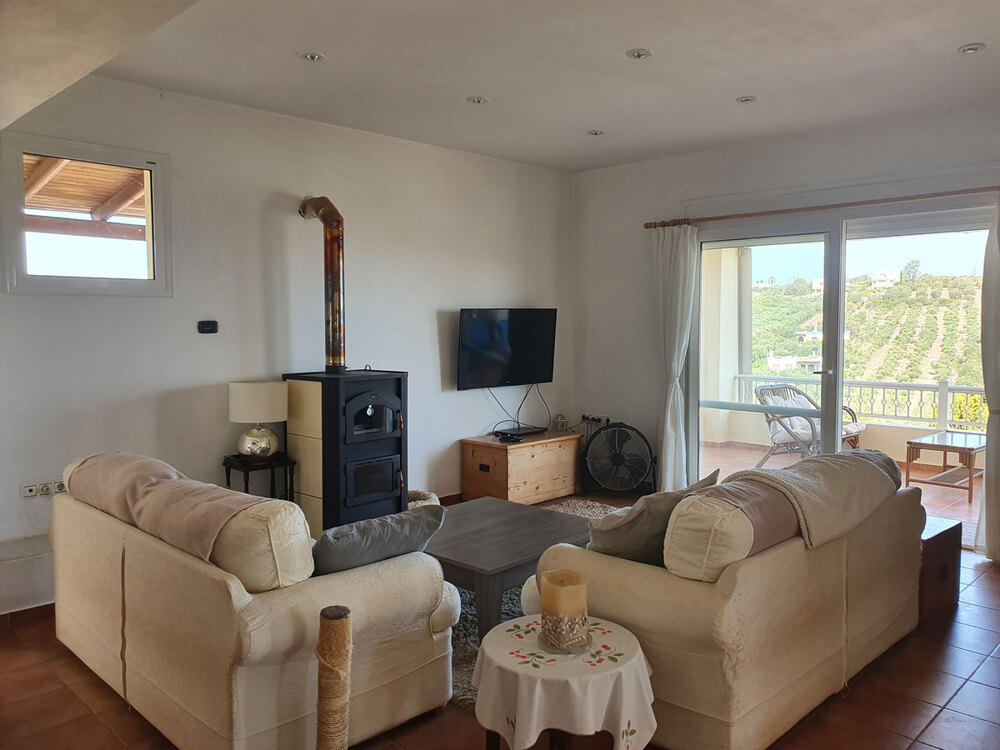 Der große Wohnbereich verfügt über eine Sitzecke mit Kamin und einen Essbereich. Es gibt eine große Veranda mit fantastischem Meer- und Bergblick.