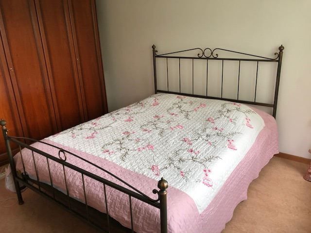 Ich habe dieses schöne klassische italienische Bett erst letzten Sommer bestellt/gekauft. Es hat noch ein Jahr Garantie. Die Farbe ist eine Mischung vom Dunkelgrün und Kupfer. Keine einzige Gebrauchsspur. Ich selbst habe die ganze Wohnung klassik mit modern kombinieret und das Bett wäre daher zu jedem Schrank -auch moderne- gut passen. (ohne lattenrost) Es ist nicht aus billigem Metall, sondern Kupfer. Sehr einfach zum montieren.
