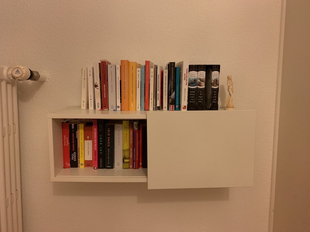 Regal mit Schiebetür, Wandbefestigung. Leichte Gebrauchsspuren. Preis 20.- Muss abgeholt werden.