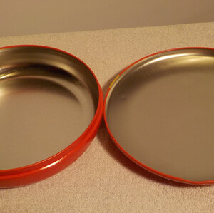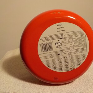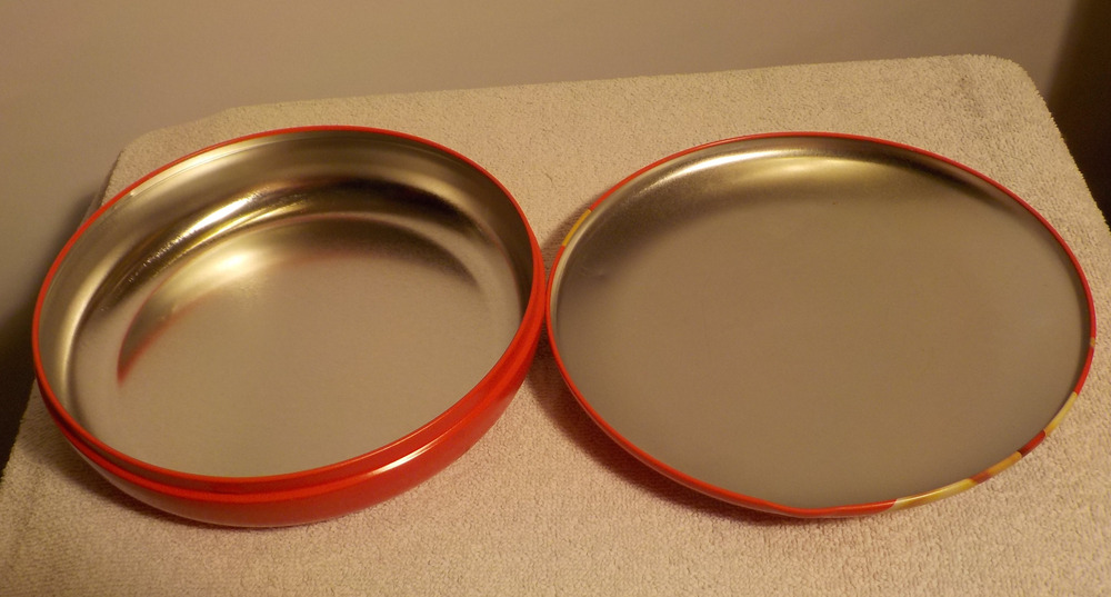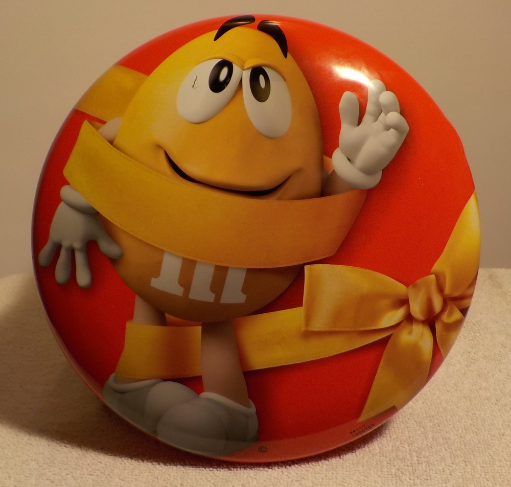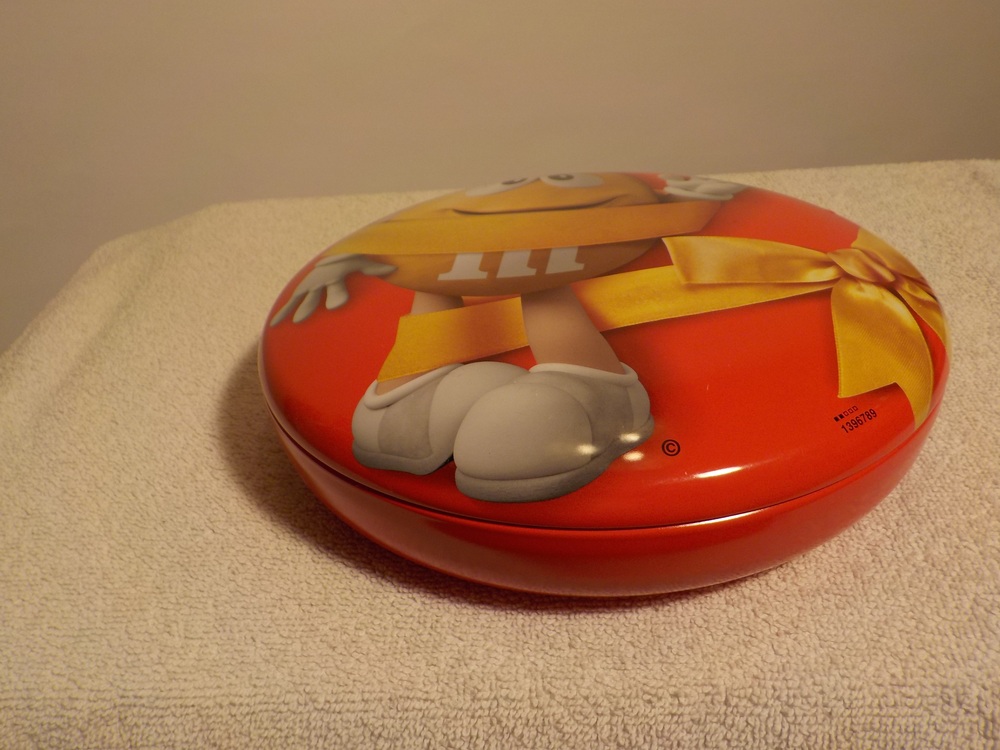 Gebrauchte M&M runde Blechbüchse / Rot -Gelb / Durchmesser: 18cm Höhe ca. 6cm / im Super Zustand