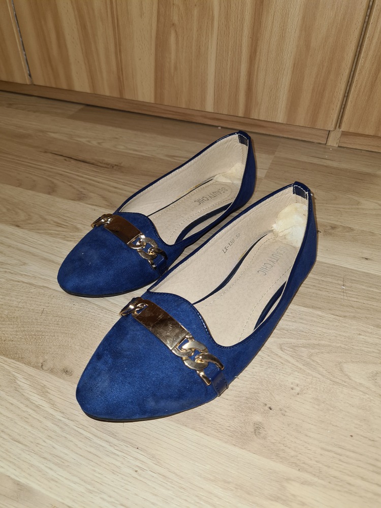 Die Schuhe sind dunkelblau und haben eine goldene Schnalle. Sie sind in einem top Zustand.