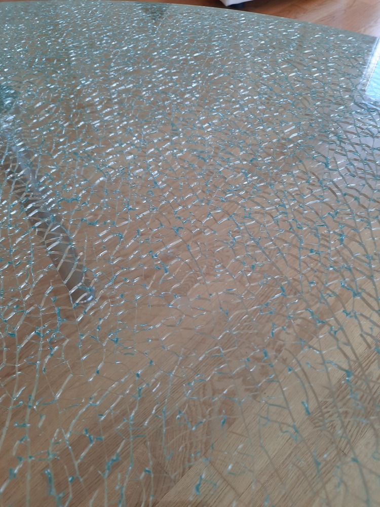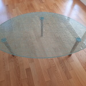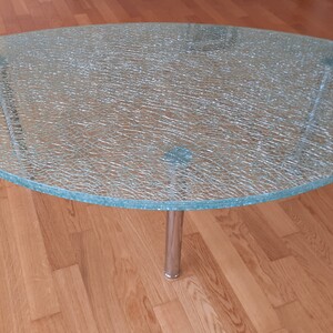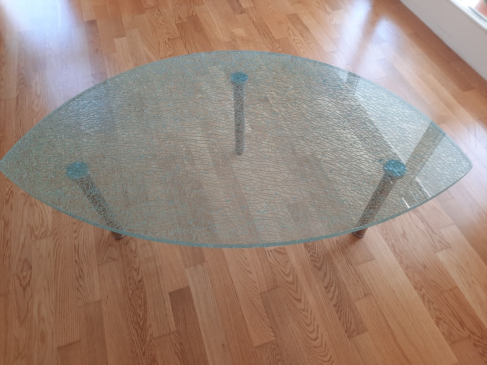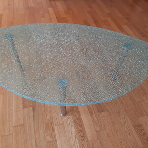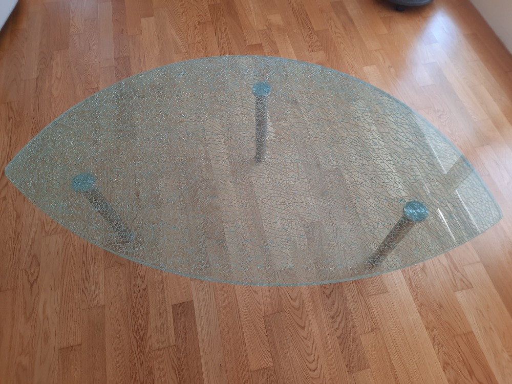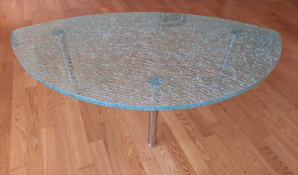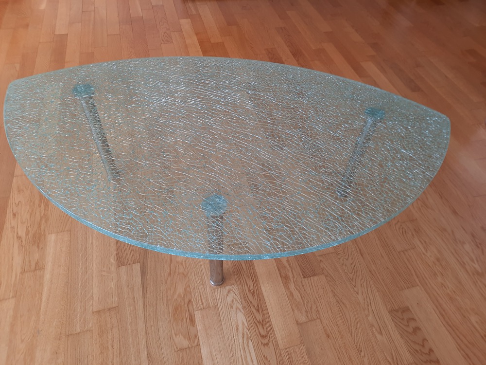Sehr stabiler Tisch aus gehärtetem Glas. Beine aus Chromstahl.