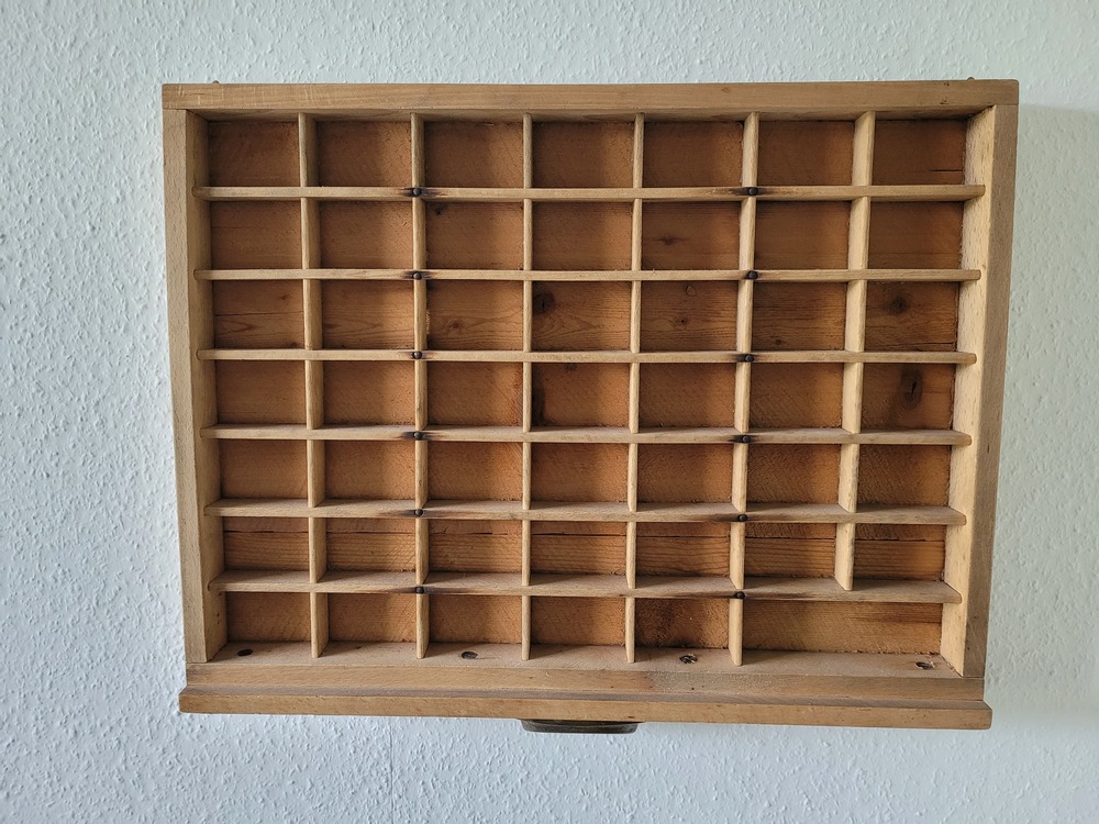 Setzkasten aus einer alten Buchsetzerei, Alter unbekannt, bei uns mindestens 30 Jahre im Besitz, Grösse 50 x 38 cm, Preis CHF. 50.-