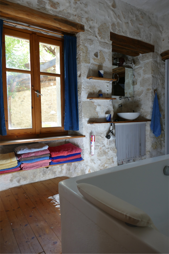 Geheizt wird nur mit Holz. Der Verbrauch, um das Haus im Winter schön warm zu heizen, liegt bei 1 bis 2 Tonnen Olivenholz. Das Steinhaus speichert hervorragend die hoch effiziente Holzofenwärme.