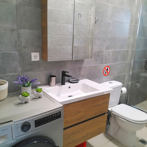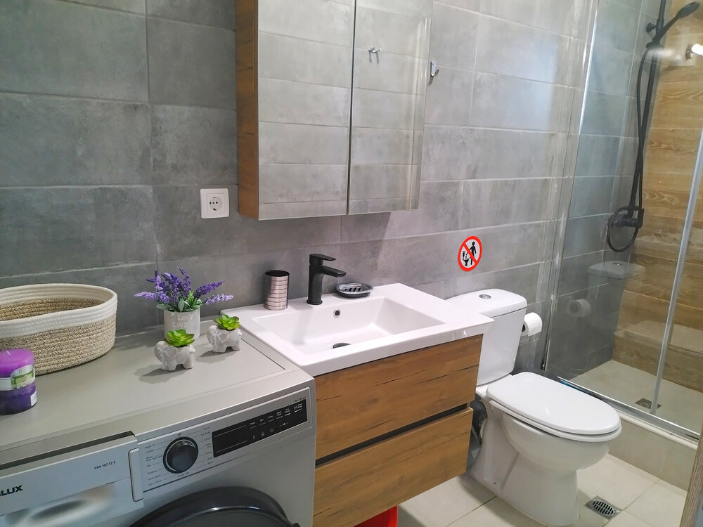 Gemütlicher Wohnbereich mit offener Küche, Badezimmer mit Dusche, Waschmaschine und Fenster, kleiner Abstellraum unter der Treppe