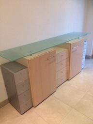 Ahorn mit zwei Alu-Riffelblech-Schubladenteile, Schubladen und zwei Türen und oben eine Glasplatte.