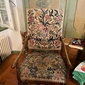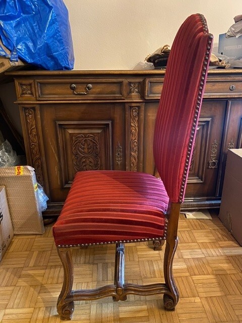 Der Stuhl ist mit rotem Samt gepolstert und Nagelkopfverzierungen ergänzen die Polsterung auf dem Sitz und der Stuhllehne.