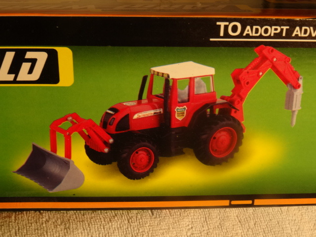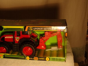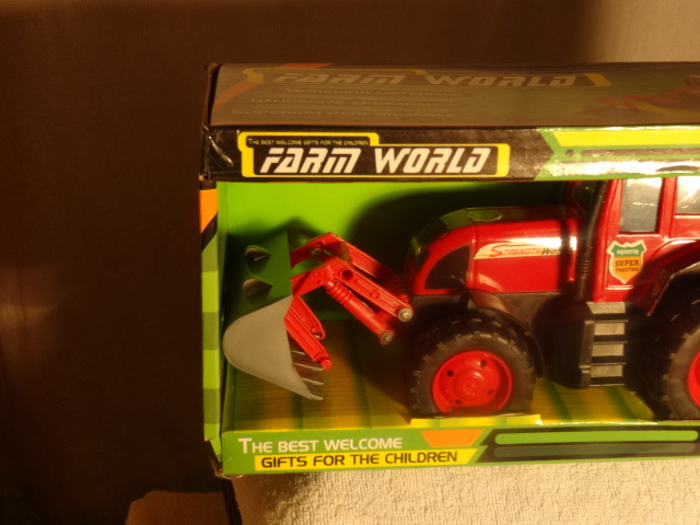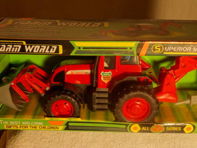 Farm World - Traktor mit Erdbohrung Gerät und Frontlader / Masse in ca.: zusammen gelegt 37cm Höhe 15cm Tiefe 11cm / In OVP / Schild - Heckbagger bewegbar / aus stabilem Kunststoff / nicht geeignet für Kinder unter 3 Jahren / Marke Farm World / Made in China